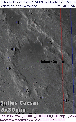 Observer: Tony Donnangelo Date/time of observation: 2003/07/20 05:50 U.T. Site location: Tuscarora State Forest, Camp Site #52, PA, USA Site coordinates: N. 40°20’43.4” (40.34538°) W. 77°33’43.7” (77.56215°) Site elevation: 482 meters (1,583feet) Site classification: State forest wilderness area Instrument: 14.5” Starmaster Dob. Magnification: 267x (7mm Nagler T6) Moon's age: 20d 11:10, illuminated 60.1% Librations: 6.6°; N/S 4.26°; E/W 4.99° Object: Julius Caesar Crater size: 90x90Km (55x55Mi) Height: 3400m (10300ft) Height/Wide ratio: 0.0378 Lunar ray coordinates: 16.0°E., 8.5° N. Rukl chart #: 34