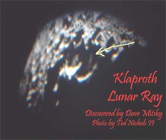 At approximately 7:20 UT (3:20 a.m. EDT) on Friday morning I noticed a very prominent sunset lunar light ray in the flooded wall plain Klaproth. This 119 kilometer diameter crater was named after the German chemist and mineralogist Martin Klaproth. It features high crater walls reaching to 4300 meters and a flat floor. Klaproth is located at 69.7 degrees south, 26.0 degrees west, and is south of the very large crater Clavius. Adjacent to it to the south is the crater Casatus. The ray was easily seen while scanning the terminator at 162x. It was rather thin and extended across the crater diagonally to the northeast. When I stopped observing the ray at 08:00 UT it had not changed appreciably. Fellow ASH member Ted Nichols II imaged the ray with his digital camera. ========== and from Tony Donnangelo ===========Observer: Tony Donnangelo Date/time of observation: 2004/10/08 06:33 U.T. Site location: Tuscarora State Forest, PA, USA Site coordinates: N. 40.51° W. 77.63° Site elevation: 427 meters (1402 feet) Site classification: State forest wilderness area Instrument: 14.5” Starmaster Dob. Magnifications: 107x, 152x, 203x Moon's age: 23d 16:00, Illuminated: 60.1% Librations: 7.7°, PA 162°, N/S -7.28°, E/W -2.39° Object: Klaproth (flooded walled plain) Crater size: 122X122Km. (72x72Mi.); Height: 4300 meters (13,000 ft.) Height/Wide ratio: 0.0361 Lunar ray coordinates: 30.0°W, 69.0°S Rukl chart #: 72 Description from Virtual Moon Atlas: Circular formation forming a double crater with Casatus. Few steep slopes supporting Klaproth A to the north, Casatus H to the southwest, and Klaproth G and H to the west. Very high walls. Very flat floor separated from Casatus by a line of crest. Craterlets. I was setup before sunset. There were only a few stray clouds during the night. Heavy dew started forming at nightfall but lessened by 07:30 U.T. I began observing the moon as it rose above the tree line at 06:33 U.T. Seeing was turbulent, but transparency was very good. Seeing became much steadier as the moon rose higher. I immediately noticed a strikingly prominent, bright, slightly cone-shaped beam of light cast on the crater floor that stretched from the western to eastern wall. It may be visible at an earlier time. Approximately two-thirds towards the eastern wall, there was a raised area, possibly the wall of a craterlet, casting a shadow perpendicular across the ray. The ray emanated from a complete break in the western wall. The eastern half of the crater was within the terminator. The eastern crest was illuminated with some very bright peaks. The western wall was completely illuminated, and the floor was completely shadowed except for the ray. The eastern interior wall of the crater Casatus, directly south of and creating a double crater with Klaproth, was extremely bright and wide, revealing the gradual slope of the wall. There was an interesting swath of light on its otherwise shadowed floor. It had a wide, rectangular shape that was quite long. It was caused by a wide, low section of wall on CasatusÂ’ western side. It remained virtually unchanged during my observing session. By 07:00 U.T., the ray began to thin. I decreased magnification because of the turbulence in seeing. Within 50 minutes, it was no longer cone shaped. At 08:20 U.T., the ray remained the same width but shortened slightly toward the west. My last observation was at 08:55 U.T. It appeared the same length, hair thin, and very dim. |