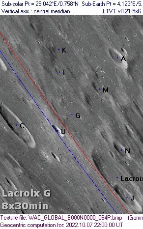 Starting Date = 2002/12/17 at 01:15 U.T. Site Longitude = +76.750 Site Latitude = +40.260 Site Elevation = +146.000 Feature = lacroix Feature Longitude: = -59.000 Feature Latitude: = -37.900 Reproducing Lighting For: 2002/12/17 at 01:15 U.T. Desired Solar Altitude = +2.049(Rising), Azimuth = +88.929 Average Co-longitude = 61.597 In the Time column, D=Daylight, T=Twilight ---- Moon's ---- -- Earth's -- Topocentric Topocentric -------- Sun's -------- UT Date Time Alt° Semi-Diam'' Long° Lat° Colong° Lat° Azim° 2002/12/17 01:15 +59.035 907.37 -2.183 +2.226 061.275 -0.414 +88.929It is seen from the given initial observation, that the desired solar altitude is +2.049 rising, at an azimuth of 88.929 degrees. The average co-longitude is 61.275.