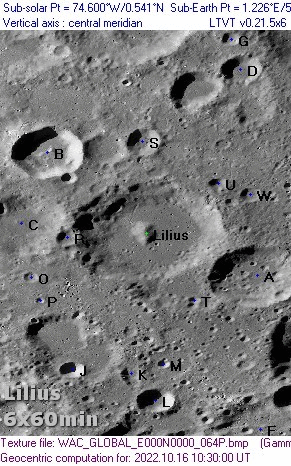 Feature = lilius Feature Longitude: = +6.200 Feature Latitude: = -54.500 Reproducing Lighting For: 2003/1/24 at 11:29 U.T. Desired Solar Altitude = +4.279(Setting), Azimuth = +273.772 Average Co-longitude = 166.418