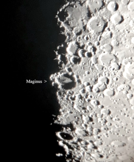 Dave Misty on April 3rd, 2023 wrote: Rob, I got a fairly good afocal iPhone shot of the Maginus lunar sunrise crater ray on March using a 6" Orion SkyQuest XT6 Dob. (dated 29 Mar 2023) - Dave