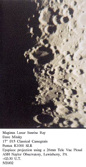 On 2002/5/19 UT a number of fellow ASH members and I observed the Maginus Lunar Ray from the Astronomical Society of Harrisburg's Naylor Observatory (670 Observatory Drive, Lewisberry, PA - http://www.astrohbg.org) during a public observing session. I didn't arrive in time to see the beginning of the event but at 2:20 UT the ray was still a relatively narrow shaft of light as seen through a 12.5" f/6.5 Cave Newtonian. Using the ASH 17" f/15 classical Cassegrain I briefly viewed the ray at 202x before setting up my Pentax K1000 and camera adapter. A 26mm Tele Vue Ploessl was employed for eyepiece projection photography of the event.Dave Mitsky Harrisburg, PA |