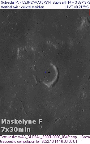 Site Longitude = +76.880 Site Latitude = +40.150 Feature = MASKELYNE F Feature Longitude: = +35.300 Feature Latitude: = +4.200 Reproducing Lighting For: 2003/1/22 at 08:40 U.T. Desired Solar Altitude = +2.068(Setting), Azimuth = +268.588 Average Co-longitude = 142.626 ================================================================== Site Longitude = +76.880 Site Latitude = +40.150 Feature = MASKELYNE P Feature Longitude: = +34.100 Feature Latitude: = +0.500 Reproducing Lighting For: 2003/1/22 at 08:40 U.T. Desired Solar Altitude = +3.355(Setting), Azimuth = +268.713 Average Co-longitude = 142.545