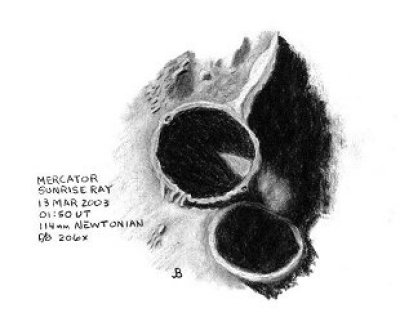 MERCATOR LUNAR RAY Observer: Dave Mitsky & Tony Donnangelo Date/time of observation: 2003/03/13 01:25 U.T. Site location: Hummelstown RD 3, PA, USA (40.26° N., 76.75° W.) Site elevation: 479 feet (146 meters) Site classification: Suburban Instrument: Takahashi FS-102 Magnification: 158x(5.2mm Pentax XL), 234x(3.5mm Orion Lanthinum SW)