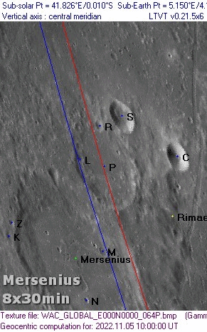 We were observing various interesting objects and shadows on the moon when I noticed a very thin shaft of light, approximately 25 Km. long, in Mersenius P. The eastern exterior wall of Mersenius was illuminated, with the remainder of the crater shadowed. Crater Ss rim and exterior was illuminated, while its floor remained shadowed. Mersenius Ps rim and eastern exterior wall was illuminated, as was the upper section of its western interior wall. Its floor was completely shadowed, except for the ray.