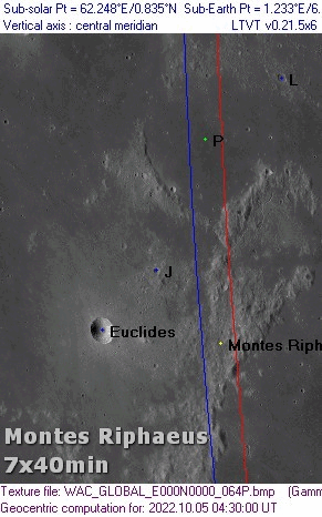 Site Longitude = +76.900 Site Latitude = +40.100 Reproducing Lighting For: 2004/5/29 at 01:30 U.T. Desired Solar Altitude = +0.482(Rising), Azimuth = +89.229 Feature = MONTES RIPHAEUS Feature Longitude: = -28.100 Feature Latitude: = -7.700 Average Co-longitude = 28.586 Moon's Altitude Restricted = N In the Time column, D=Daylight, T=Twilight ---- Moon's ---- -- Earth's -- Topocentric Topocentric -------- Sun's -------- UT Date Time Alt° Semi-Diam'' Long° Lat° Colong° Lat° Azim° 2004/05/29 01:30T +51.939 958.83 -7.467 -3.926 028.681 +0.700 +89.229