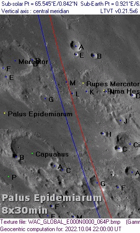 Feature = PALUS EPIDEMIARUM Feature Longitude: = -28.200 Feature Latitude: = -32.000 Reproducing Lighting For: 1999/8/21 at 05:30 U.T. Desired Solar Altitude = -3.198(Rising), Azimuth = +91.524 Average Co-longitude = 24.428 In the Time column, D=Daylight, T=Twilight ---- Moon's ---- -- Earth's -- Topocentric Topocentric -------- Sun's -------- UT Date Time Alt° Semi-Diam'' Long° Lat° Colong° Lat° Azim° 1999/08/21 05:30 +13.640 897.06 -1.440 -4.626 024.680 +0.404 +91.524