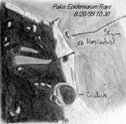 8/20/99 at 10:30pm PDT, at the SJAA public star party at Houge Park, we were entranced by a lovely pair of rays in Palus Epidemiarum. I made this sketch with my VX102 refractor (then flipped it later to match with the map view), but in a nearby 10" reflector, interesting detail was visible, barely illuminated by the rays, on the floor of Palus Epidemiarum. |