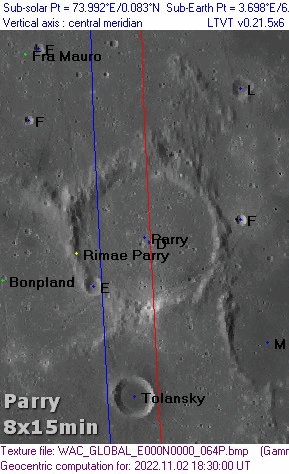Observer: Tony Donnangelo Date/time of observation: 2003/01/11 23:15 U.T. Location of site: Hummelstown RD 3, PA, USA (40.26° N., 76.75° W.) Site Elevation: 479 feet (146 meters) Site classification: Suburban Moon s age: 08d 14:51, 59% illuminated Instrument: Takahashi FS-102 Magnification: 91x(9mm NaglerT6),158x(Pentax 5.2mm XL), 234x(3.5mm Vixen SW), Object: Parry (crater) Lunar ray coordinates: 8.0°S., 15.5°W. Rukl Chart #: 43