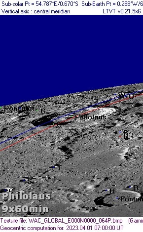 Philolaus, -165,+949: A crater 46 miles in diameter, with terraced walls rising 12,000 feet above a floor upon which are many irregularities, the two highest being south of the center.Near the north-east wall is a ridge, and a craterlet-chain runs along the outer west wall., continuing far north to a ring which contains two prominent craters. There is a large landslip on the west,. At the foot of the inner southeast wall there is a hillock, and there is another on the north-east. It has been reported that the shadow shows a slight brownish cast. Philolaus overlaps an ancient ring on the east. (Wilkins and Moore, The Moon, Faber & Faber Ltd., 1955)