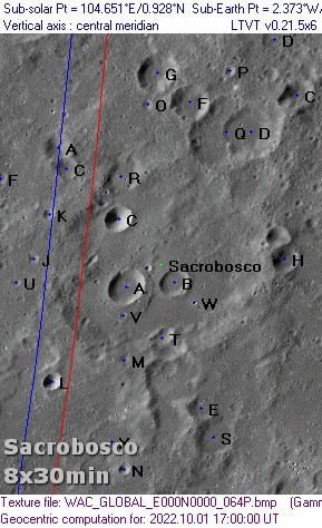Description from Virtual Moon Atlas: Wrecked and isolated circular formation. Pretty steep slopes supporting many craters with Sacrobosco G & F to the north, Sacrobosco L to the southwest, and the double crater Sacrobosco H to the east. Damaged and high walls ridden by Sacrobosco R to the north and presenting debris to the northeast. Immense and tormented floor supporting three important craters: Sacrobosco A & B to the center and Sacrobosco C to the north. Hills craterlets and depressions.