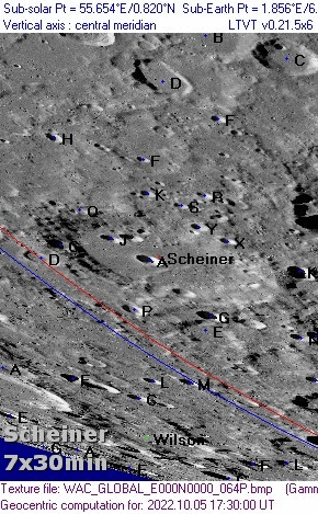 Scheiner, -230,-870: A great crater, 70 miles in diameter, with walls magnificently terraced on the inner slopes and of great height. Some of the wall peaks attain 18,000 feet above the depressed floor. There are craters on the inner south and east slopes. To the west of the crater, on the south slope, is a smaller crater, and east of it a partial ring, from which a narrow edge runs across the floor. This was described by Webb as a partition. On the interior are a nearly center crater, five craters to the north of it, another at the foot of the inner north slope, several rills and a craterlet. To the southwest is an old ring, the site of its former wall being now marked by hills. (Wilkins and Moore, The Moon, 1055, Faber and Faber Ltd, London)