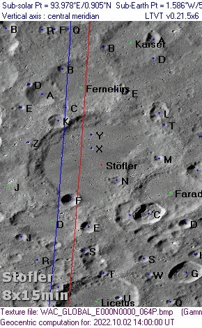 There is also a second ray or lighting spike above the main one, much closer to crater F. Since Stöfler is next to the terminator the crater base is pitch black, so the contrast for seeing the beams is excellent. I suspect this may be a gradual lighting of the base of the crater, even though it appears flat in this area. Other craters along the terminator, with equally dark bases and jagged rims are now showing this same event. Neal>>>>