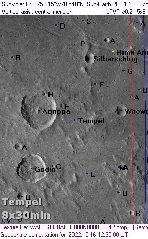 Tempel has a disintegrated wall. There is a ridge extending from its southern end into a flat plain. There is also an area of ridges east of crater Godin. There is a gap between the two ridge complexes. The ray emanated from this location and extended eastward toward craters Arrest and A. The eastern half of Tempel was within the terminator and may be hard to pinpoint. It would be easier locating the craters Godin and Agrippa.