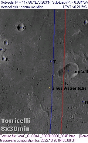 TORRICELLI, +475 -084 [Italian physicist, 1608-47]. A remarkable double ring, the larger component being on the west and 12 miles in diameter, with a slight break on the south. The smaller, eastern component is 5 miles in diameter, with the wall broken down at the point of contact with the larger ring, and with two minute craterlets at the point of junction on the south. Owing to the gap, Molesworth, Arthur and others have seen a ray of light, at sunrise, shining through the gap and onto the floor of the formation. Burrell and Thornton have seen a cleft traversing the floor of this object, shown, however, by Burrell as a craterpit-chain. The smaller ring also has a gap in its east wall, with a craterlet outside to the south, and the sunlight sometimes streams through this outer gap before passing through the inner and thence on to the floor. From the south wall, a long cleft is said to run to the east; Thornton and Moore have seen a ridge to the east of the smaller component. Two other, shorter and parallel clefts have been reported on the south, with another further east. Goodacre mentions the triple system of clefts on the south, but Thornton has hailed to confirm this with his 18 inch reflector. To the west are two more clefts on the rim of a large and prominent ancient ring, traceable in its entirety but very low in places, Torricelli being situated on its interior but not centrally. This ring must once have been a most imposing object; now, the wall is especially low on the north and here are some crater chains. They run parallel to the cleft from the north wall of Torricelli. Several minute craterlets will be found scattered over the interior of this old ring.