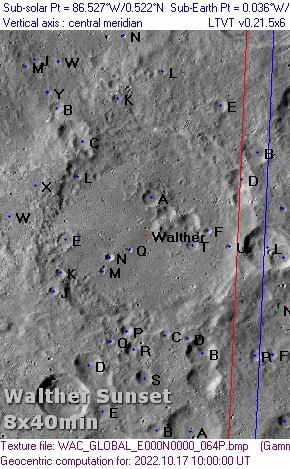 I just thought that I'd bring you to speed on the whole Walther/Walter thing in case you haven't heard. It seems that there's been some confusion about the true name of the crater Walther. Old lunar atlases, including the original Kalmbach Press Atlas of the Moon by Antonin Rukl, used the name Walter, which apparently was changed to Walther by the IAU in 1979. I was using the old Rukl atlas when I discovered the "Walter" Ray and the name on chart 65 was, of course, Walter.