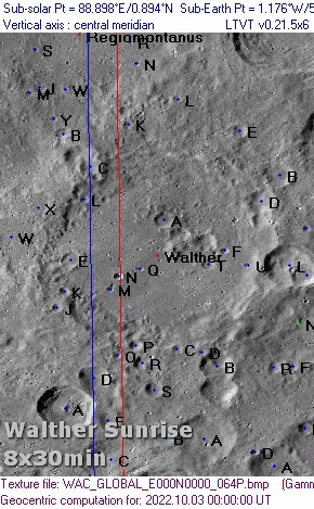 Description of Walter taken from the Virtual Moon Atlas website: It was formed during the Nectarian geological period (from 3.92 to 3.85 billion years ago). A circular formation with steep slopes supporting many craters with Nonius to the southeast, Walter C to the northwest, and Walter D & Nonius L to the east. It has very high walls with terraces, immense flat floor that contains Walter E to the west and a group of craters with Walter A to the northeast. Craterlets and lines of crests line the floor.